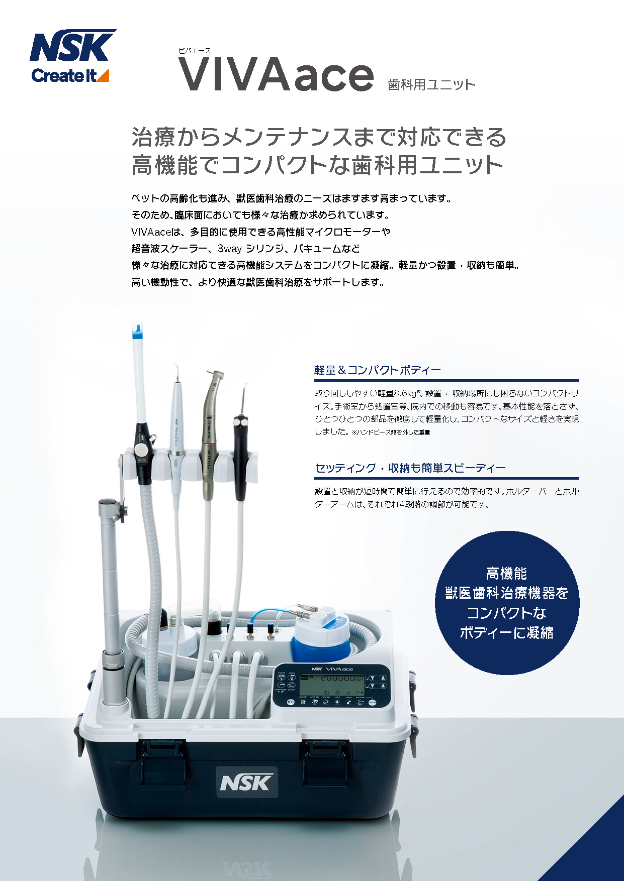 VIVA aceは、多目的に使用できる高性能マイクロモーターや超音波スケーラー、3way シリンジ、バキュームなど、様々な治療に対応できる高機能システムをコンパクトに凝縮。軽量かつ設置・収納も簡単。これまでになかった高度な機動性で、より快適な獣医歯科治療をサポートします。